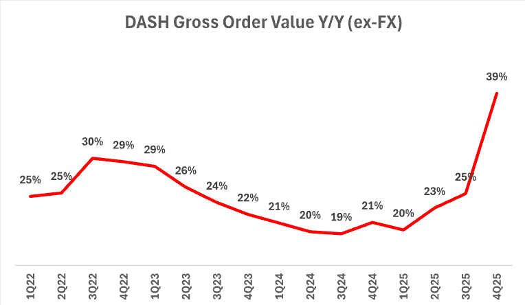 DoorDash continued to grow in 2025, with Q4 revenue up 38% to $3.96 billion, and the full year figure coming in at $13.7B. Q4 orders were up 32% to 903 million, while GOV climbed 39% to $29.7B (besting growth at IC and UE,) implying that AOV ticked up nicely. The company logged $935 million in profit for the year, up nicely from $123M the year prior. DoorDash is predicting GOV of $31.0-31.8 billion for Q1, but CEO Tony Xu’s Letter to Stockholders paints a picture of even bigger growth on the back of local commerce, autonomous systems and tighter integration between DD, Wolt and Deliveroo. The stock popped 9.9% off of the news.