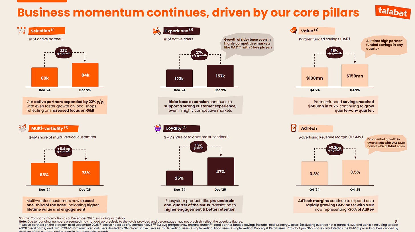 Despite strong growth, Talabat stockholders sold off sharply after the Middle Eastern delivery biggie predicted that continued investments would burn cash and shrink margins. The company is targeting $150M in new investments for 2026, with two thirds going towards Talabat Mart (groceries, dark stores) and its Talabat Pro loyalty program, while the remaining spend will grow its core restaurant delivery business. Adjusted EBITDA margins are now projected to come in at 4.4-4.8%, down from 6.5% last year. The company’s Dubai-listed stock is down about 22% since the earnings release, while majority owner Delivery Hero has also fallen.